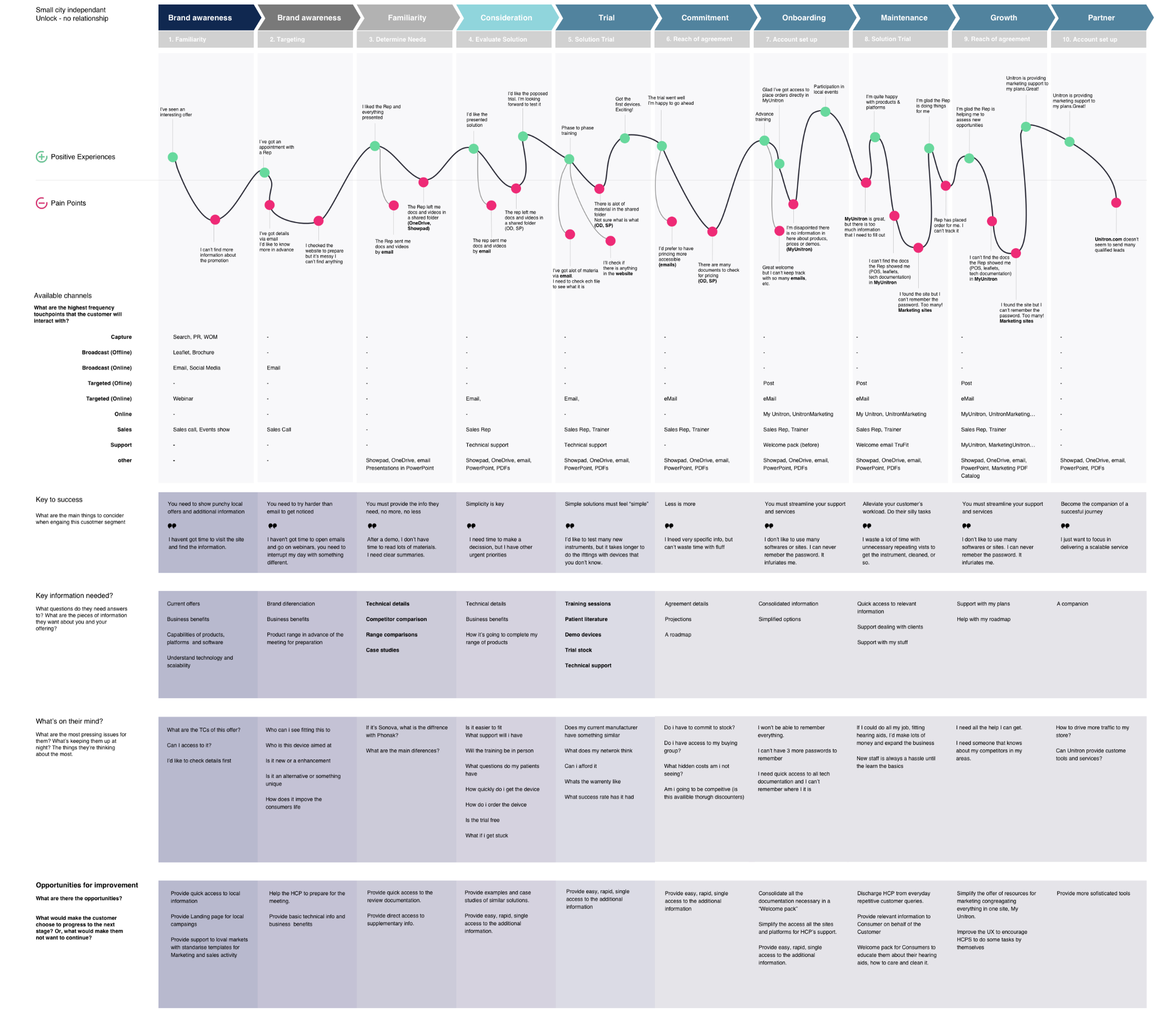 Establishing a B2B Customer Experience Map & Channel Strategy Framework is a transformational and high impact exercise that requires quantitative and qualitative customer needs research, which is used to shape a step by step journey that maps out the customers considerations across each stage of the journey your organization aims to take them on. These considerations are broken down by segment, and the channel strategy that is layered into the framework maps out the content, tools and communications that should be used within each stage of the journey organized by campaign channel (i.e. paid media, PR, outside sales, social etc.).