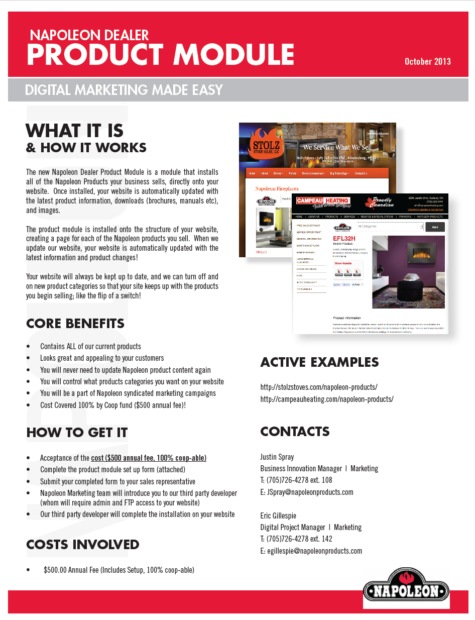 Innovated, conceptualized, and managed development of Digital Product Module. This module was designed as a method for establishing an immense competitive edge across all dealer websites within the Napoleon dealer network. The module is embedded on dealer websites worldwide, and immediately updates their website with complete range of product pages, updating all content and downloads connected directly from the branded Napoleon website database.
